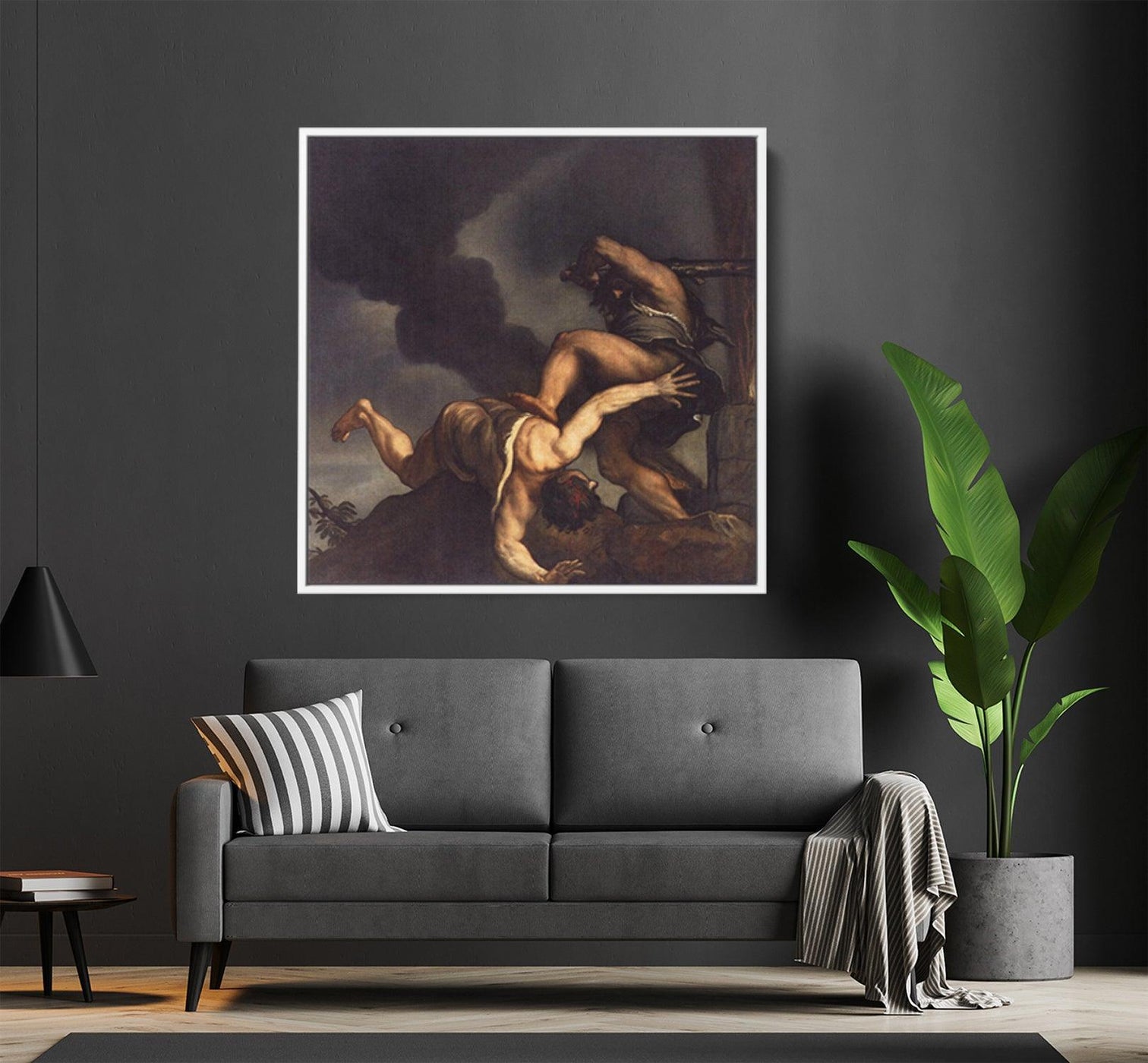 The scene in question is the first murder recounted in the Genesis narrative. Cain and Abel were two brothers, the first sons of Adam and Eve. Cain, the firstborn, was a farmer, and Abel was a shepherd. The brothers made sacrifices to God, but God accepted the firstlings offered by Abel rather than the first fruits offered by Cain. Cain, full of jealousy, called out Abel into the fields, and slew him.